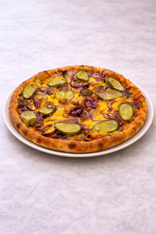 Burger szószos alap, chedar sajt, csemege uborka, lilahagyma, Gyroshús marhahúsból