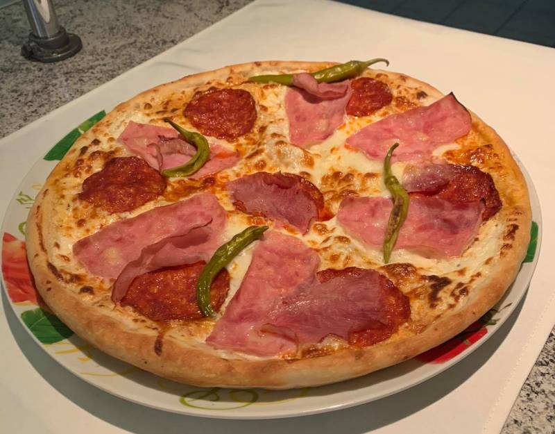 Sajtkrém alap, 123 Mozzarella sajt, fetasajt, Főtt tarja, pepperóni paprika, sonka, szalámi paprikás