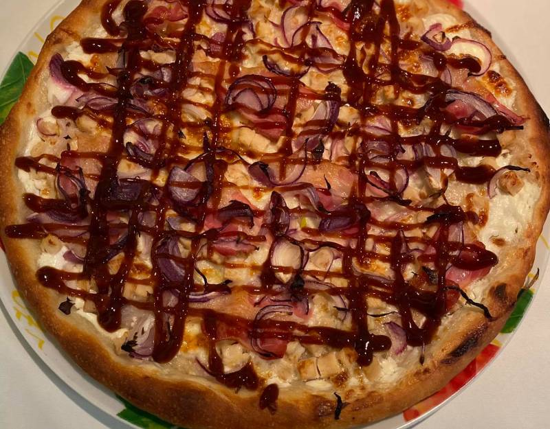 Tejfölös alap, 123 Mozzarella sajt, Eidami-ementáli-mozzarella-füstölt mozzarella, Bacon szalonna, BBQ SZÓSZ, csirkemell roston, lilahagyma
