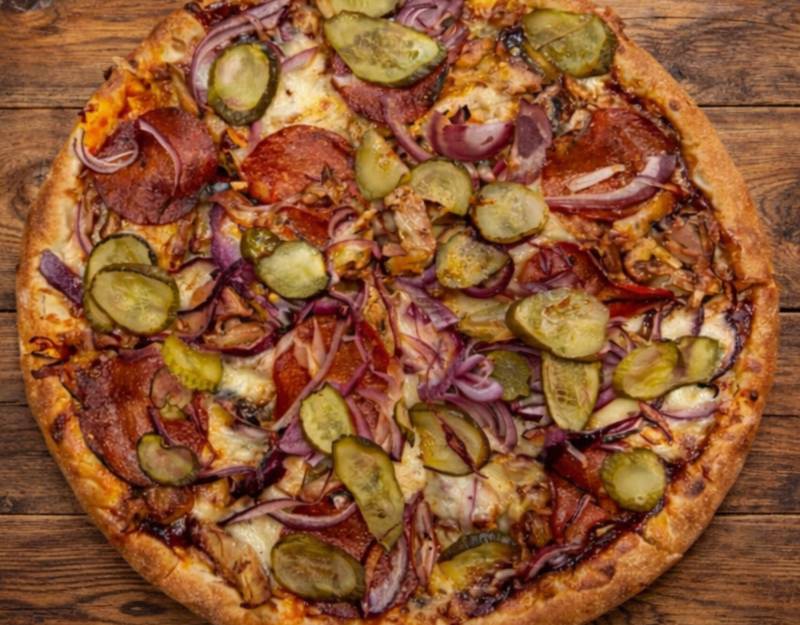 BBQ alap, csemege uborka, Gyroshús csirkecombból, lilahagyma, Pizzatészta alap, szalámi paprikás