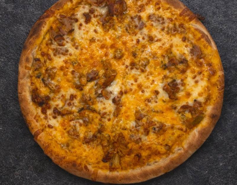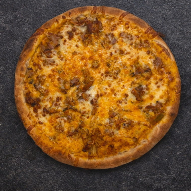 Bacon szalonna, chedar sajt, Gyroshús csirkecombból, Jalapeno, Pizzatészta alap