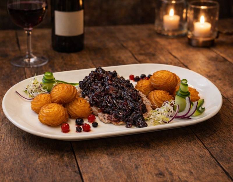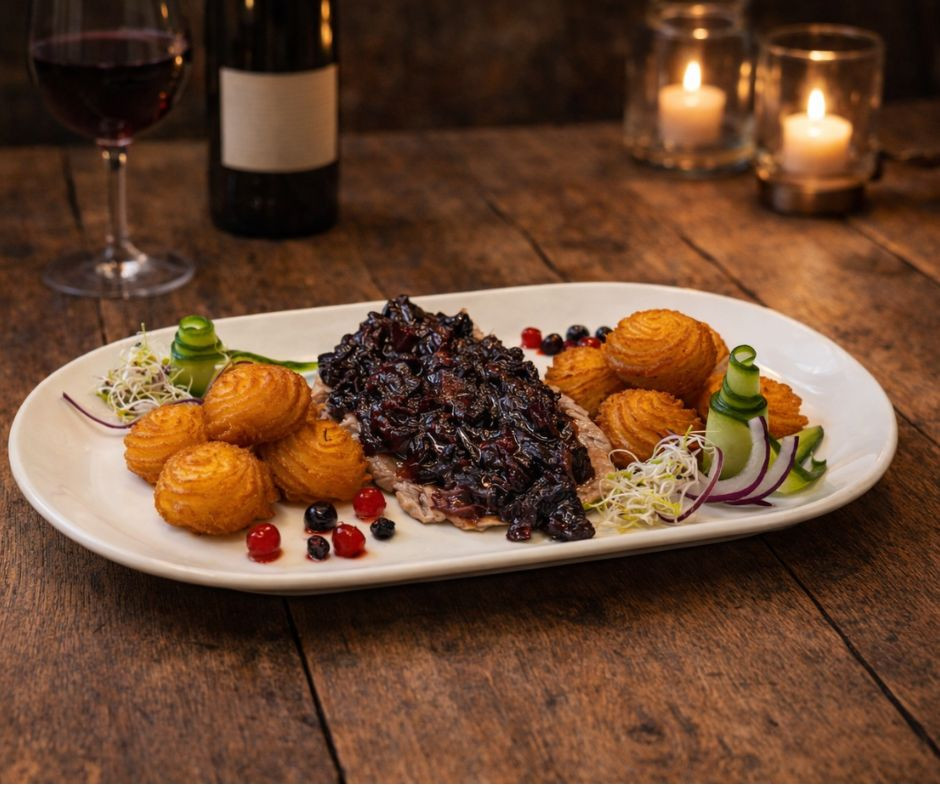 Aszalt szilvás vörösboros mártás, Köret: hercegnő burgonya